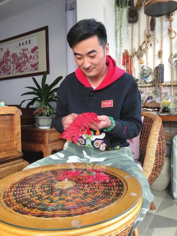 今年31岁的李宝恩自幼喜欢民俗文化,动手能力强,小时候看见村里婚丧嫁娶的剪纸用品,便搜集过来模仿着去剪。没有合适的纸,他就收集别人扔掉的烟盒,用里面的金色纸片剪纸。直到上初中后,姐姐在济南买了三本剪纸教材,他才真正了解剪纸,熟知剪纸寓意和剪纸语言。