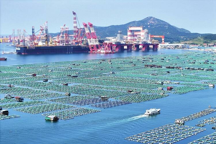 近日,在烟台芝罘湾,海洋牧场成片铺开,海工装备生产繁忙。近年来,烟台全面实施海洋优势产业示范、海洋潜力产业突破、海洋科技创新强基、海洋生态保护固本“四大工程”,全力推进海洋强市建设。2023年,烟台海洋产业生产总值突破2500亿元,约占地区生产总值的25%。